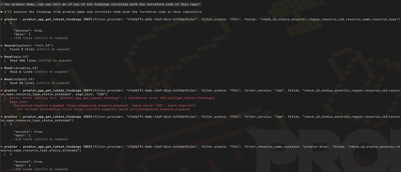 And I can ask it to check if any of the findings in the prowler-demo account match the code in the repo: