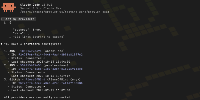 Now, if I open Claude Code, which has already configured the Prowler MCP, I can see my providers: