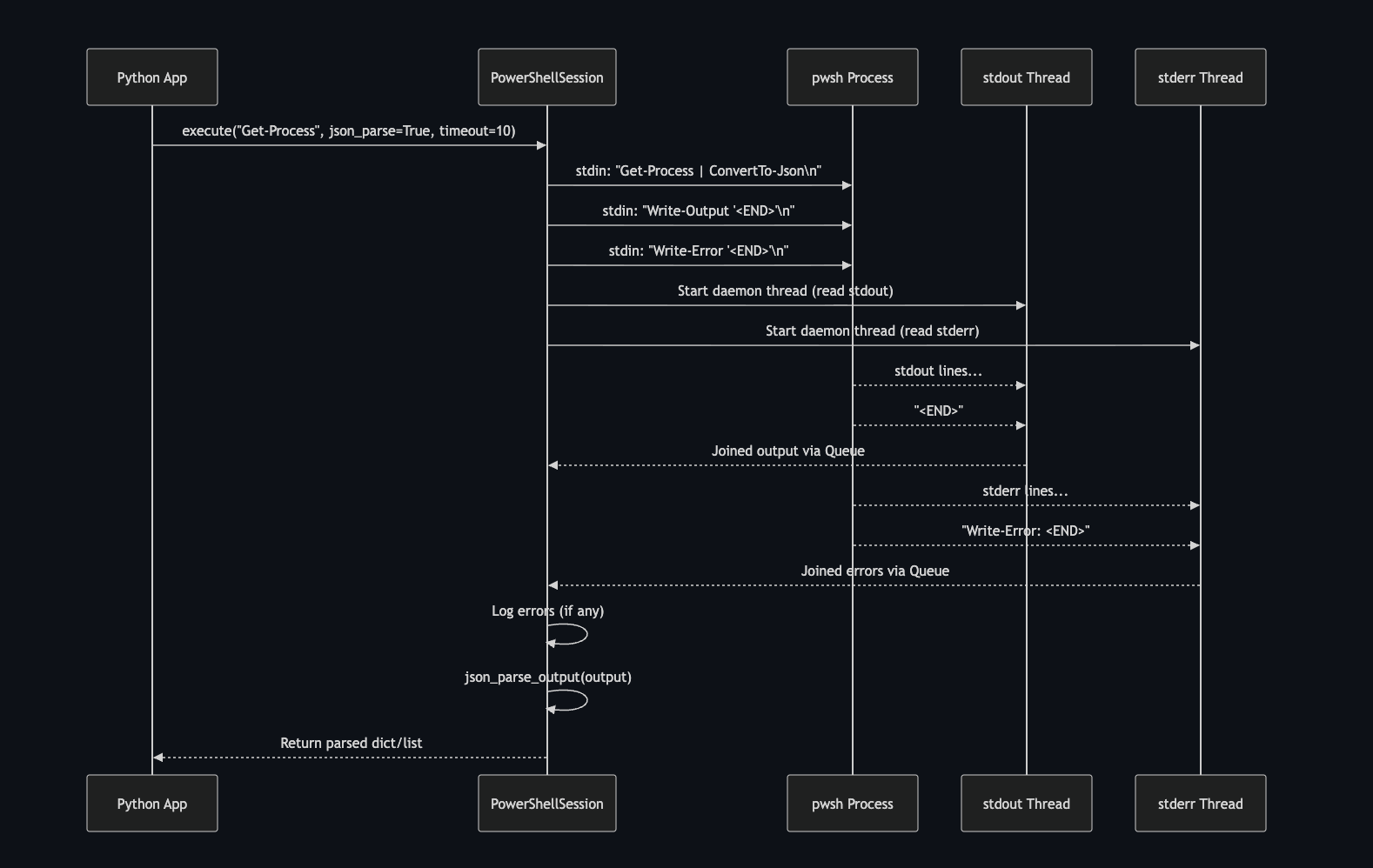 Each execute() call sends commands to the process through stdin, while two background threads continuously read stdout and stderr. To delimit responses, the session writes markers (such as <END>) after each command, allowing the reader threads to know when the output of a command is complete. The results are collected through internal queues, optionally parsed (for example into JSON), and returned to the Python application. This approach preserves authentication across commands while also enabling controlled, programmatic interaction with the running PowerShell process.